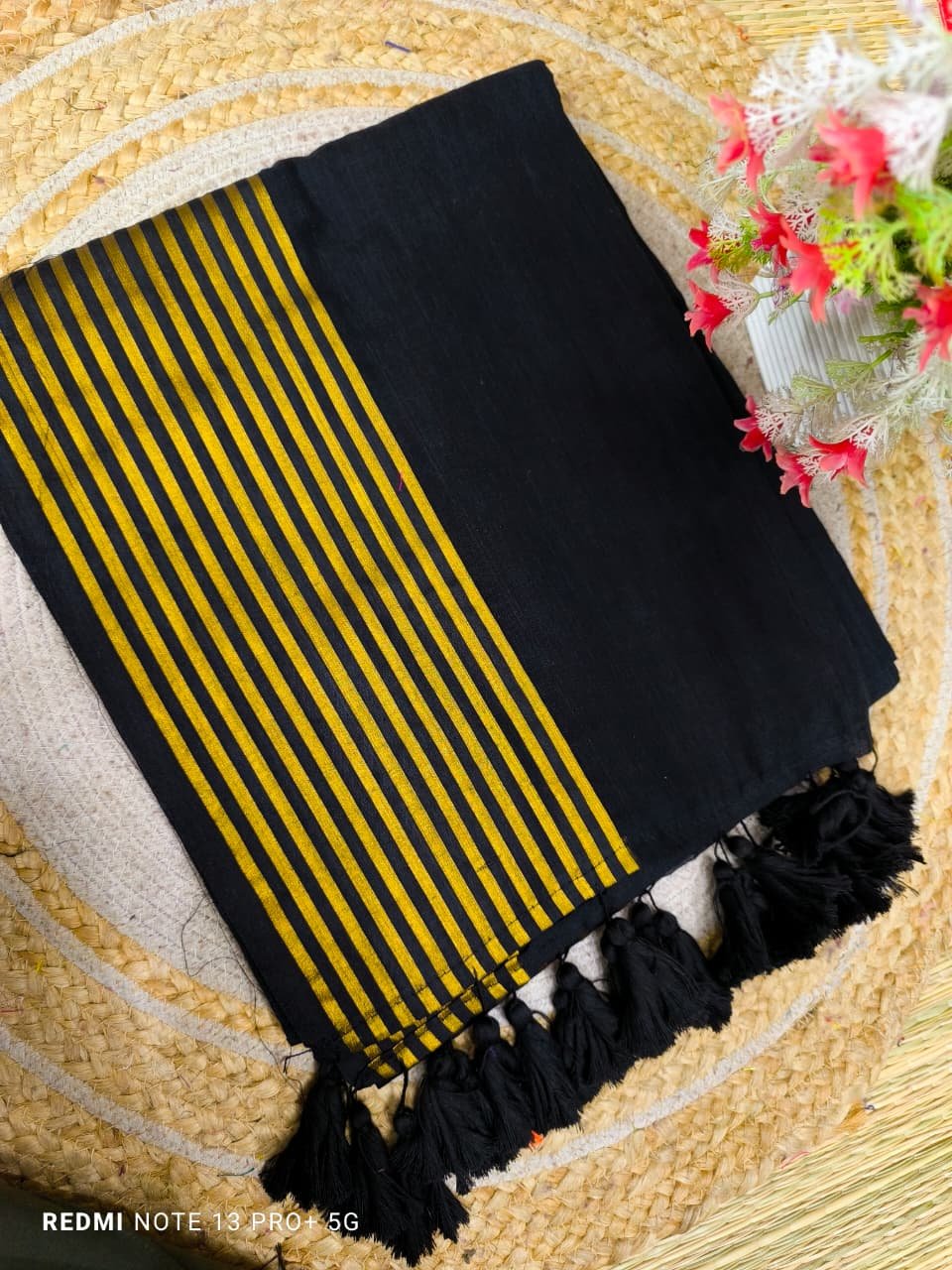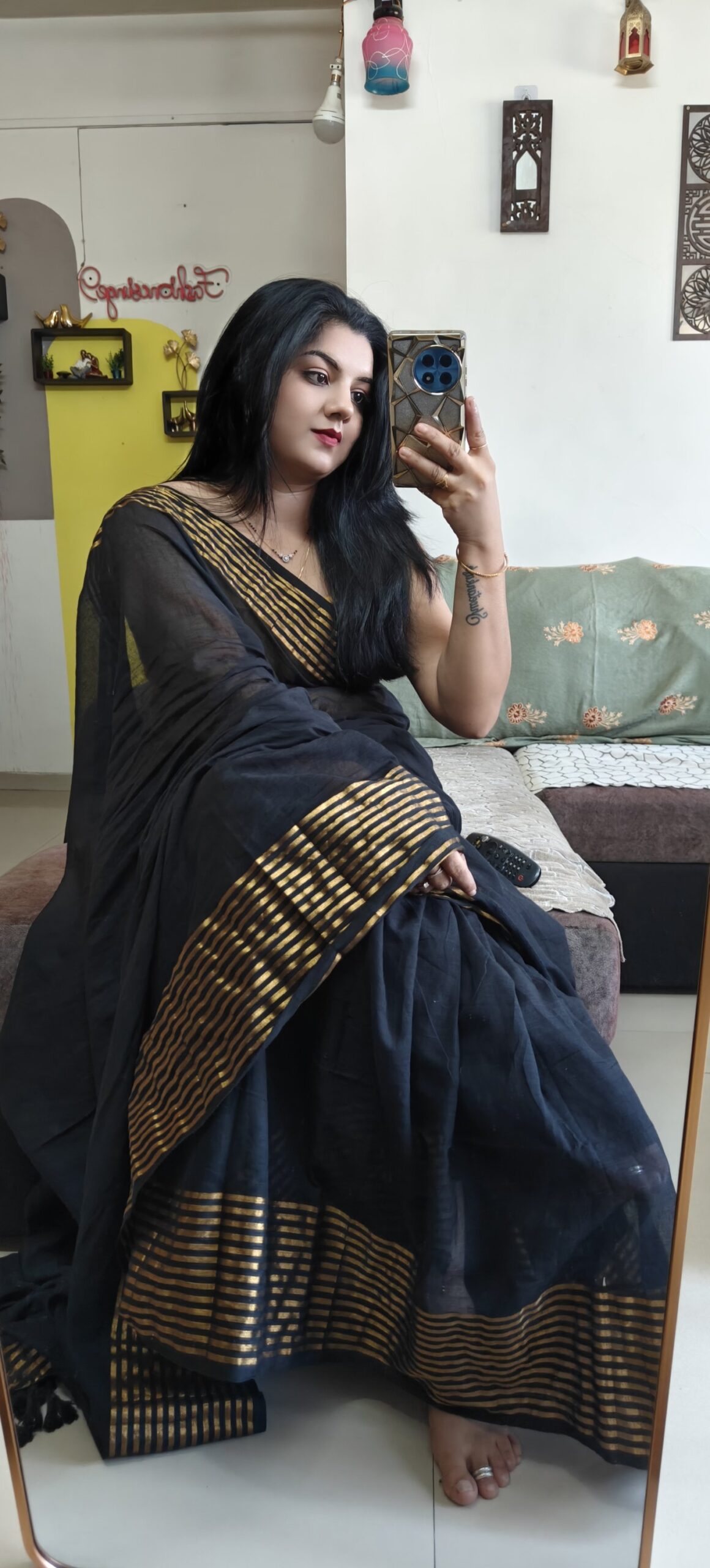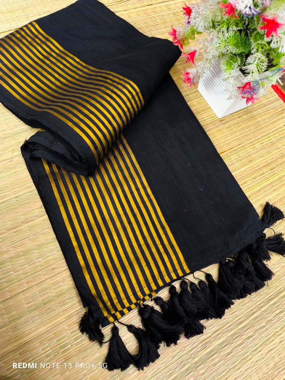Beautiful soft black Mul cotton Saree with golden strip pattern
