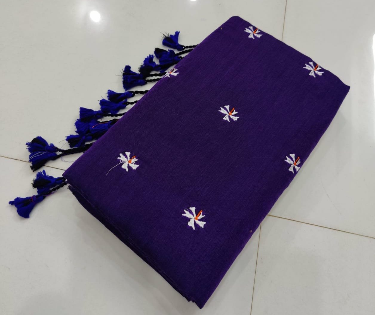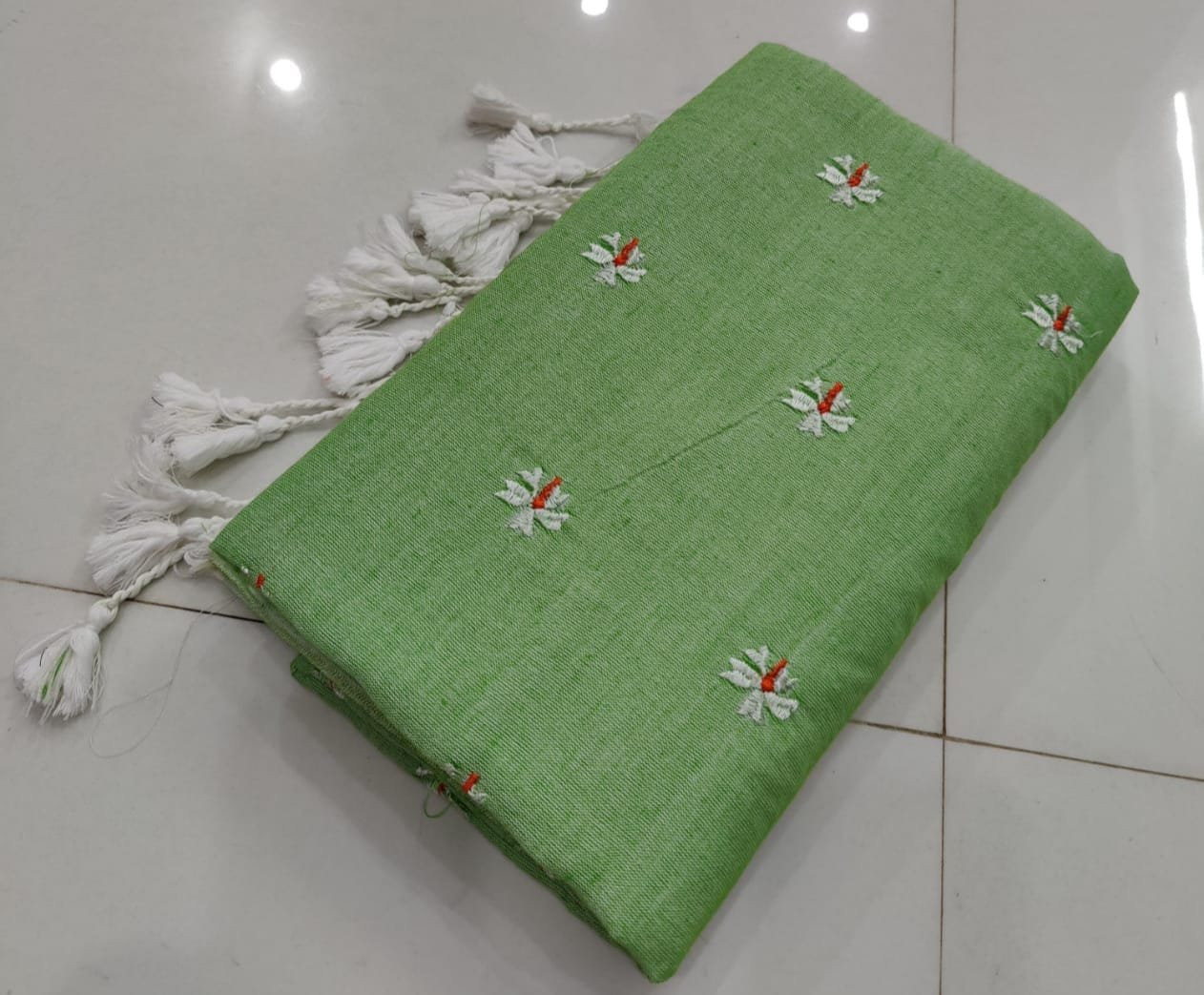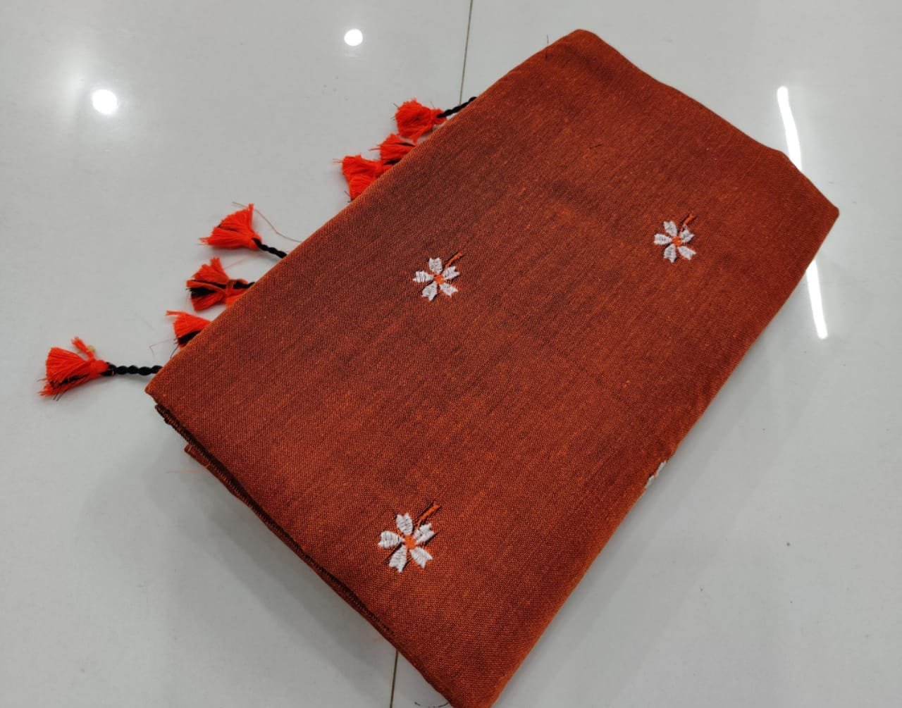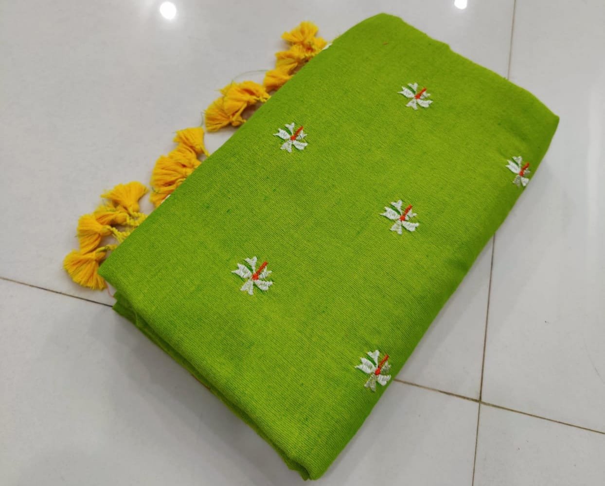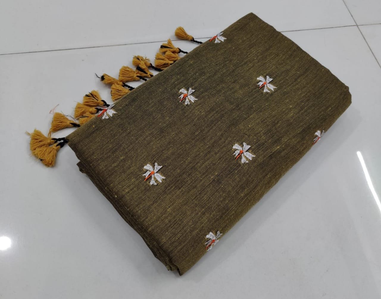 Beautiful elegant khadi cotton saree with parijatak flower embroidery design.