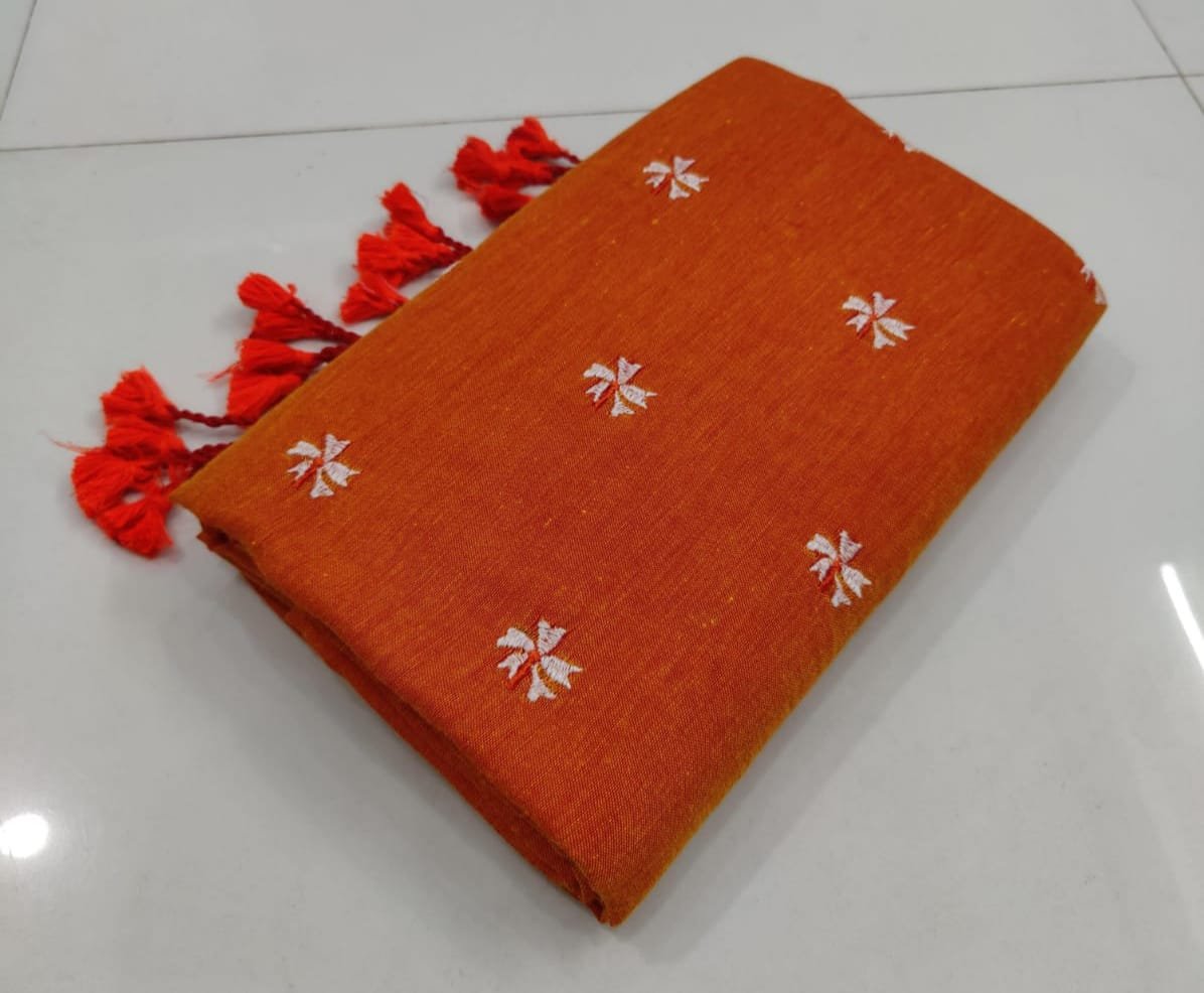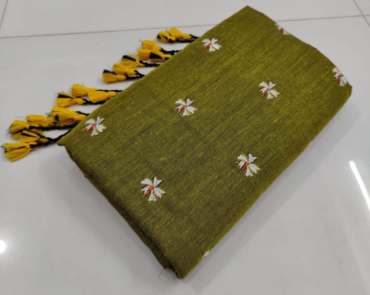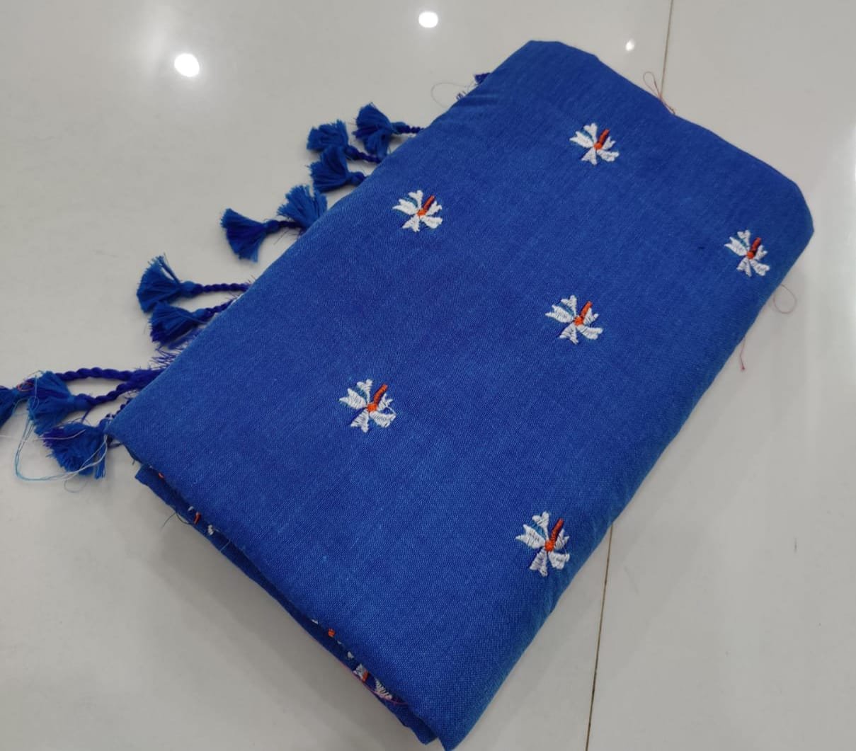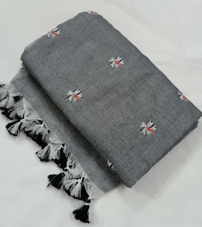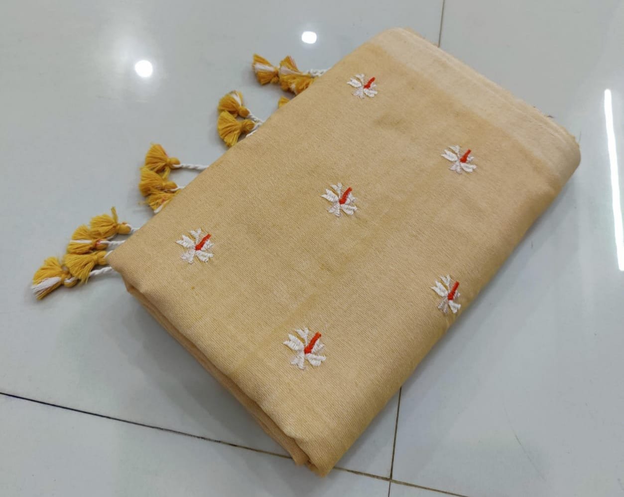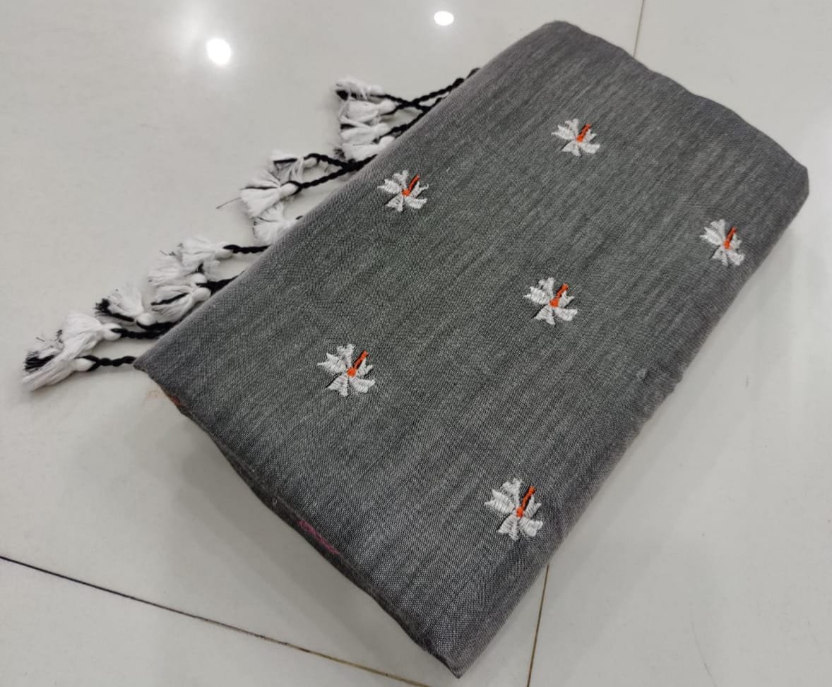 Beautiful elegant khadi cotton saree with parijatak flower embroidery design.
