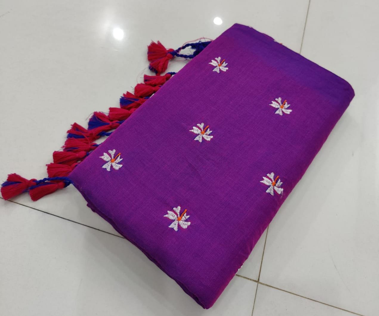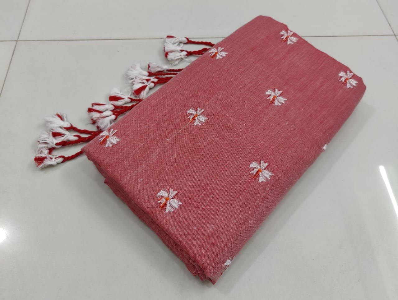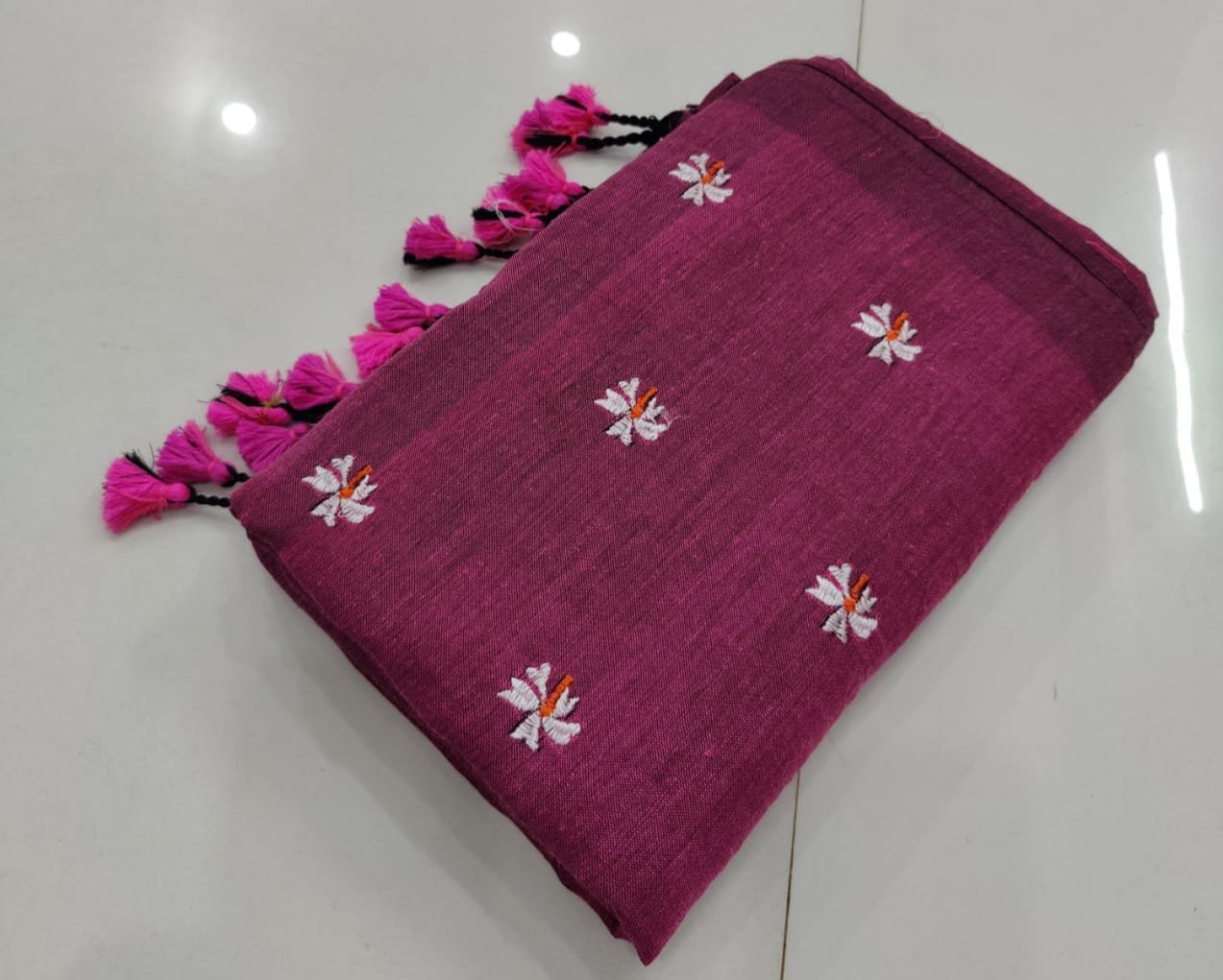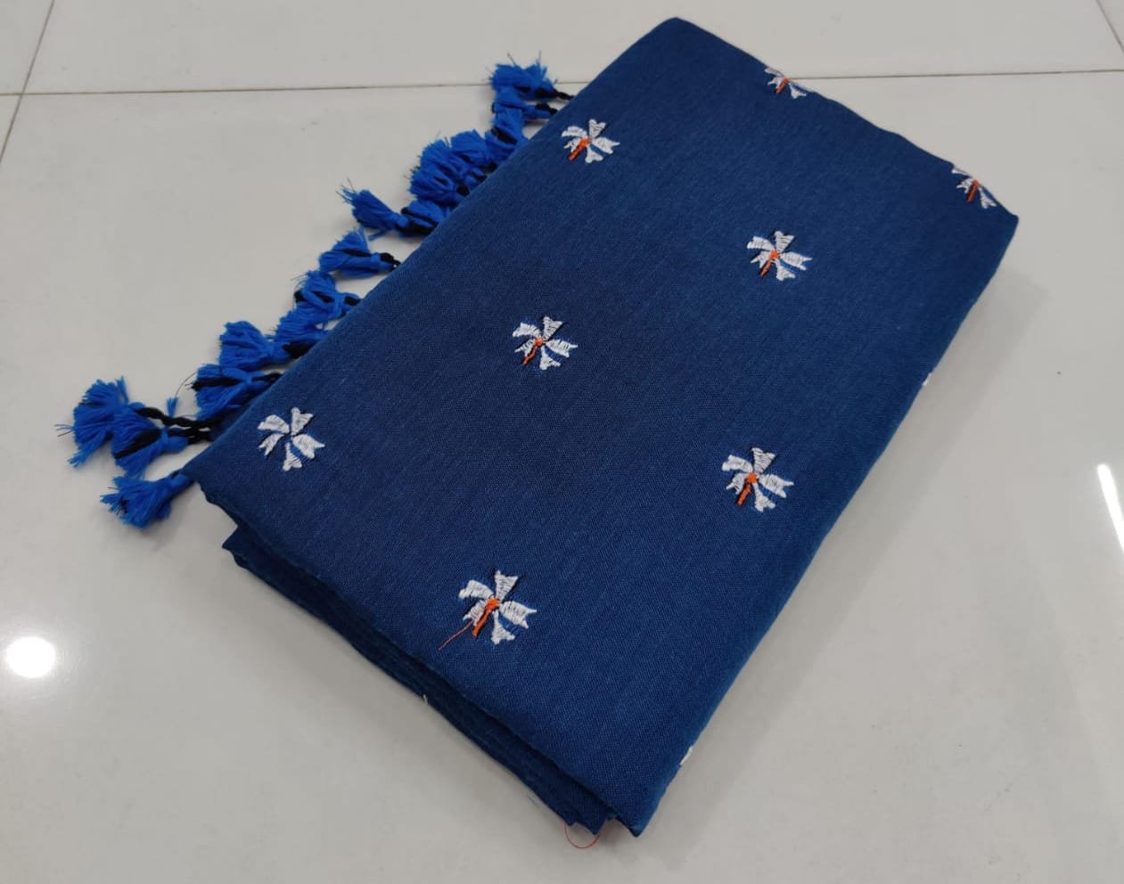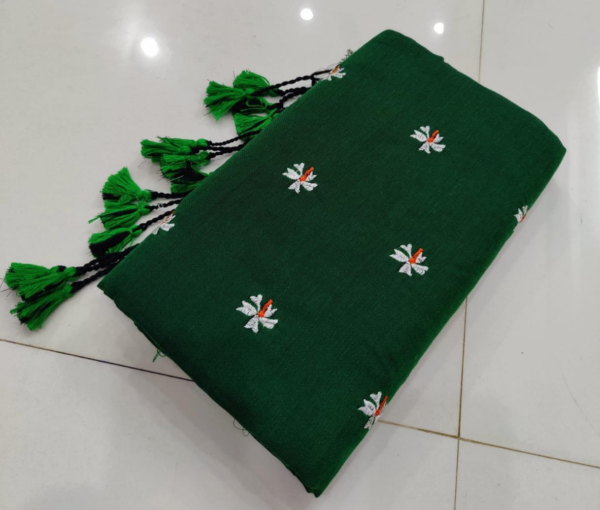 Beautiful elegant khadi cotton saree with parijatak flower embroidery design.