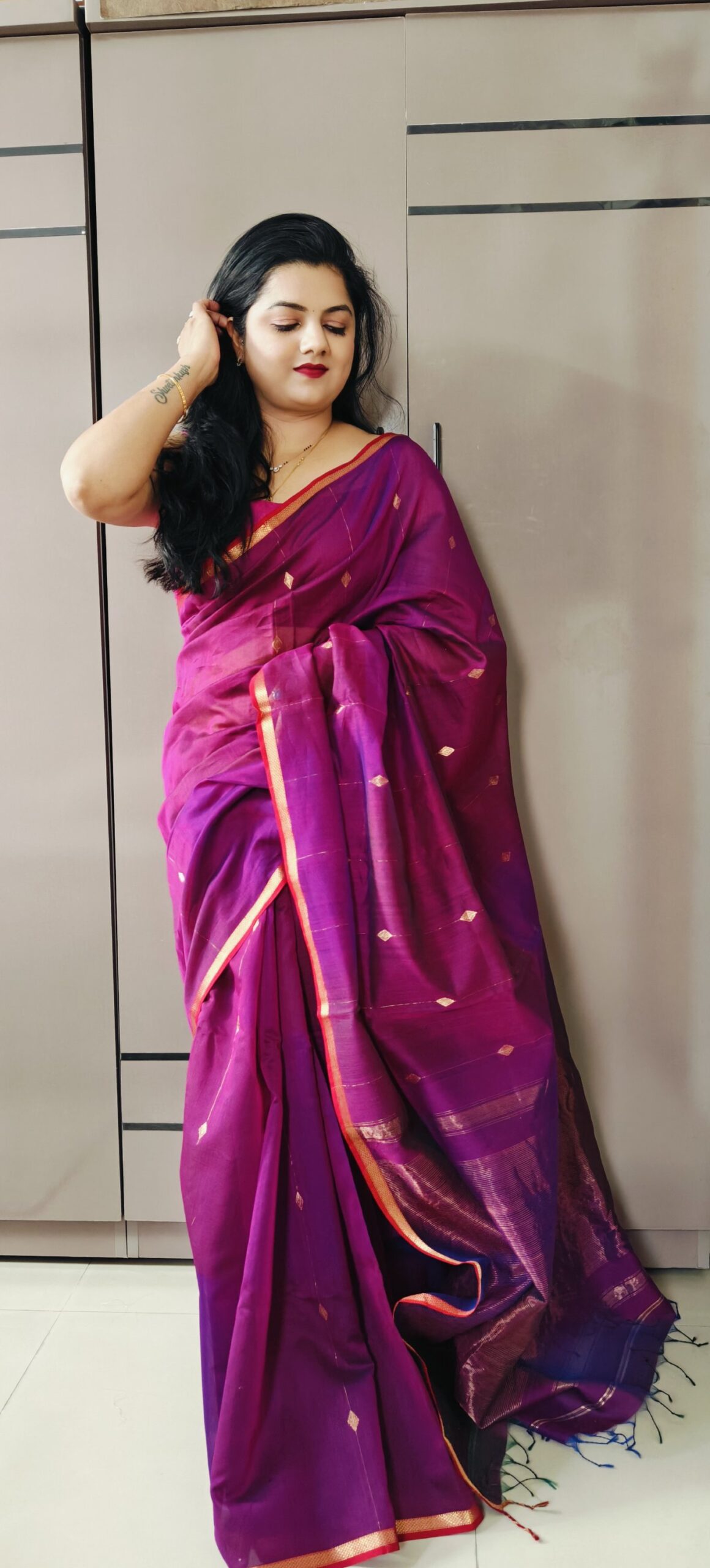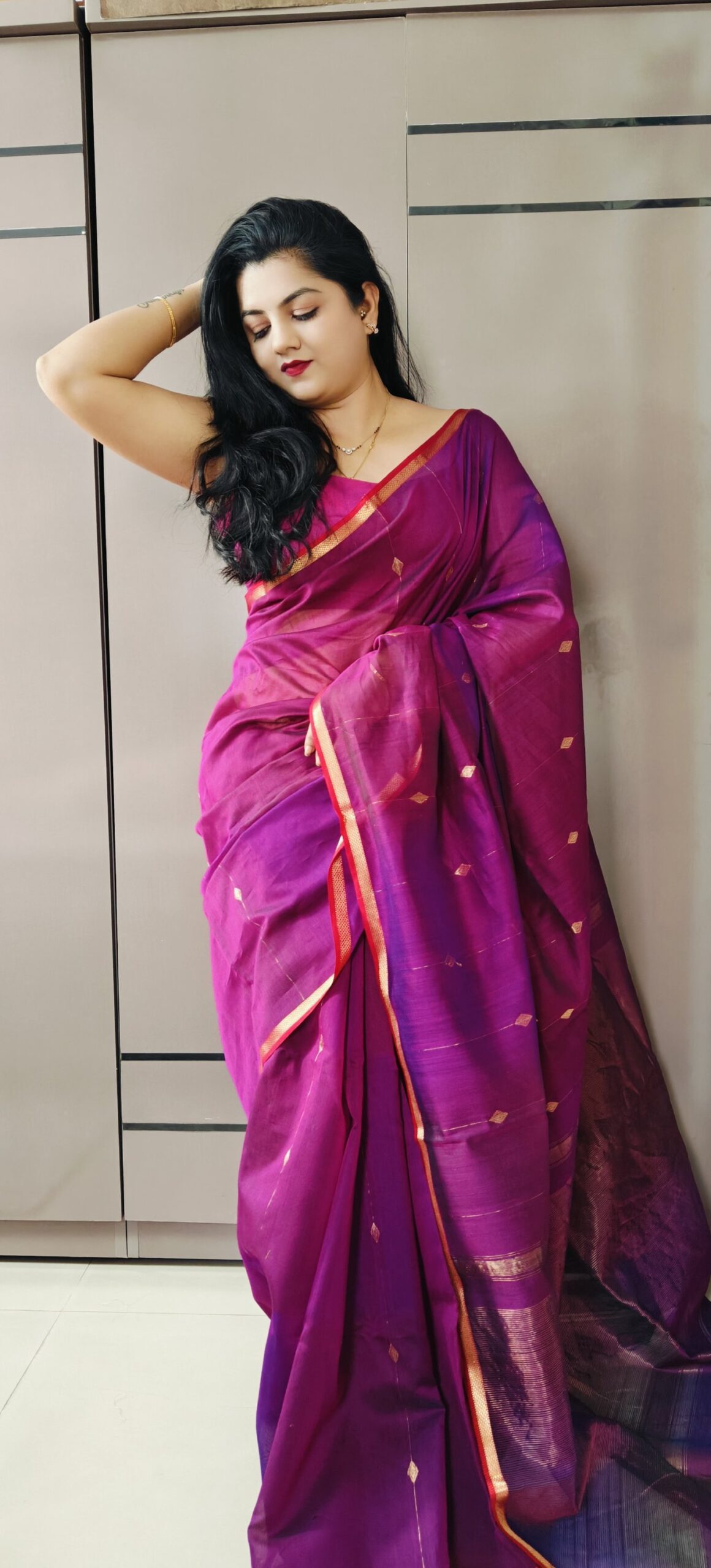 Pure Handloom Dual colour shaded maheswari silk saree. small border, golden jari pallu.