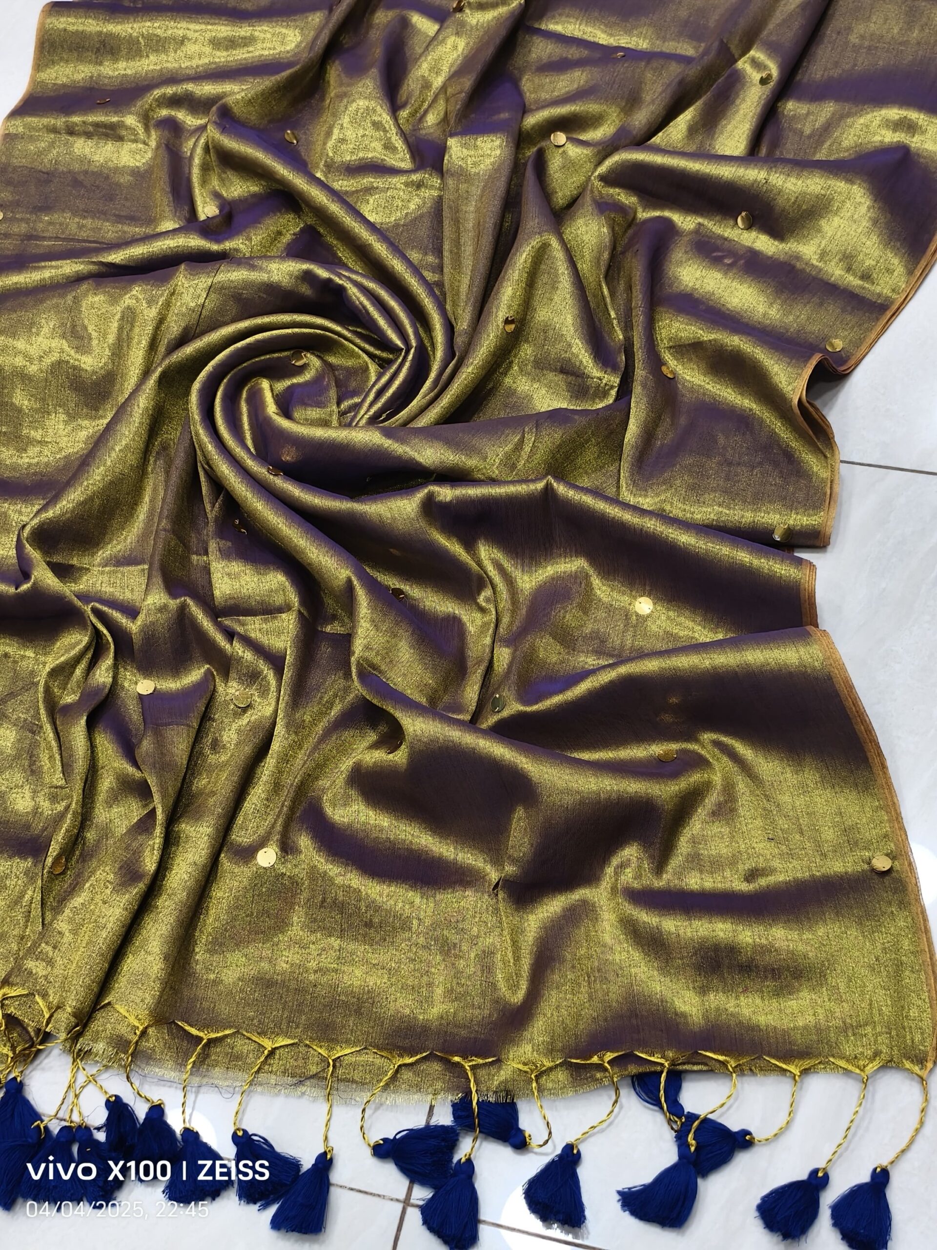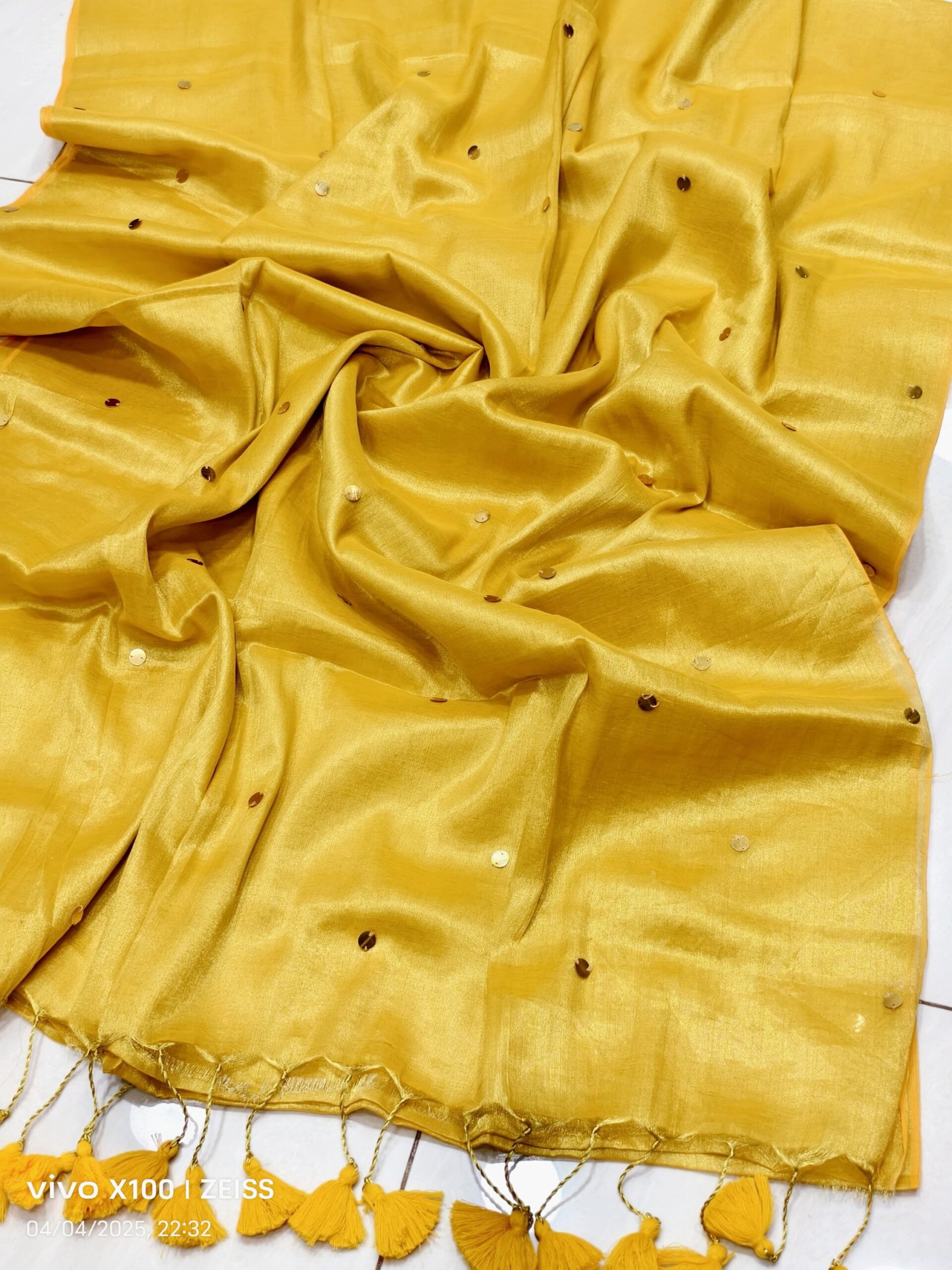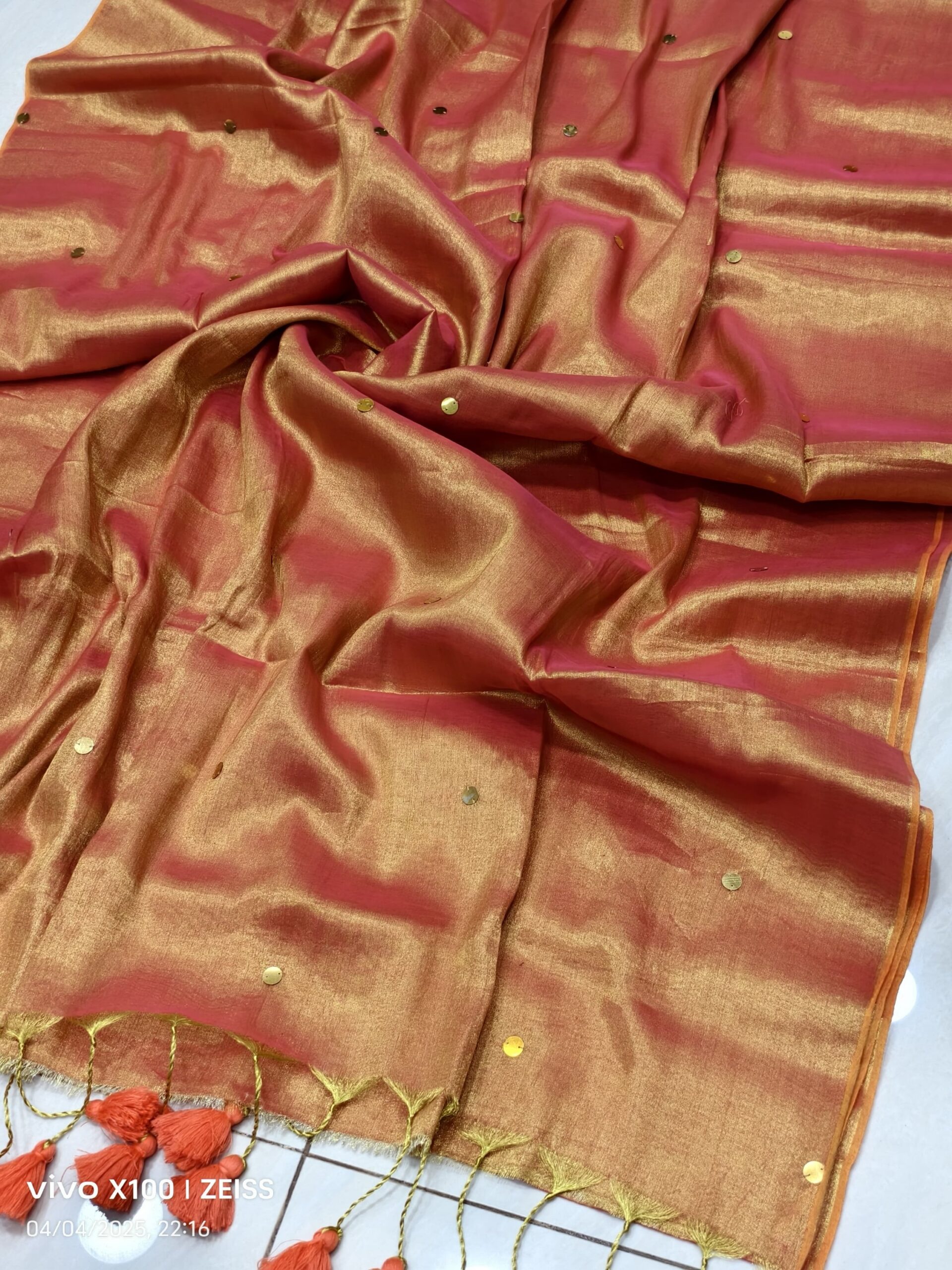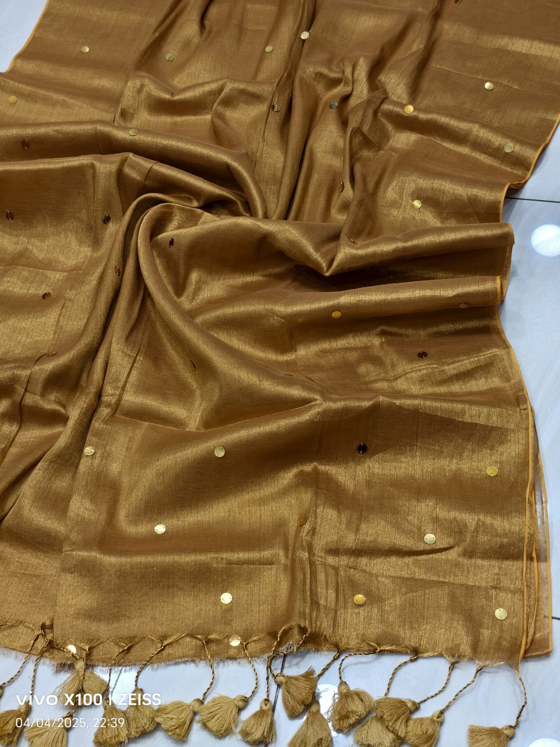 soft elegant shiny tissue silk saree with golden ginni