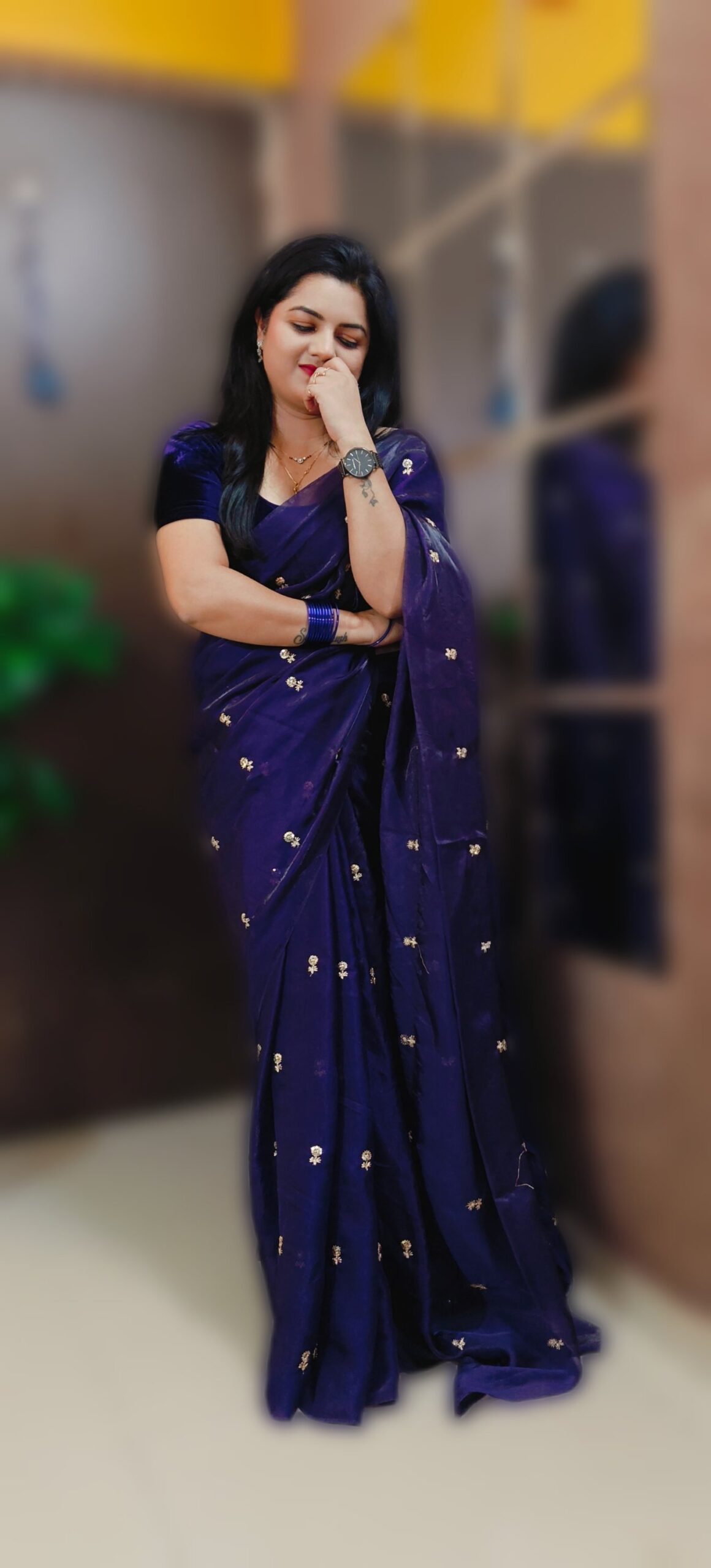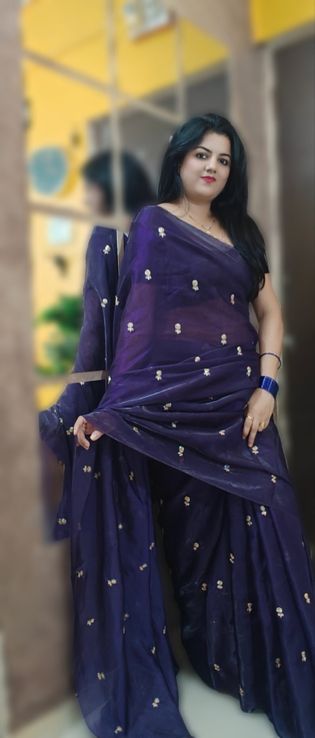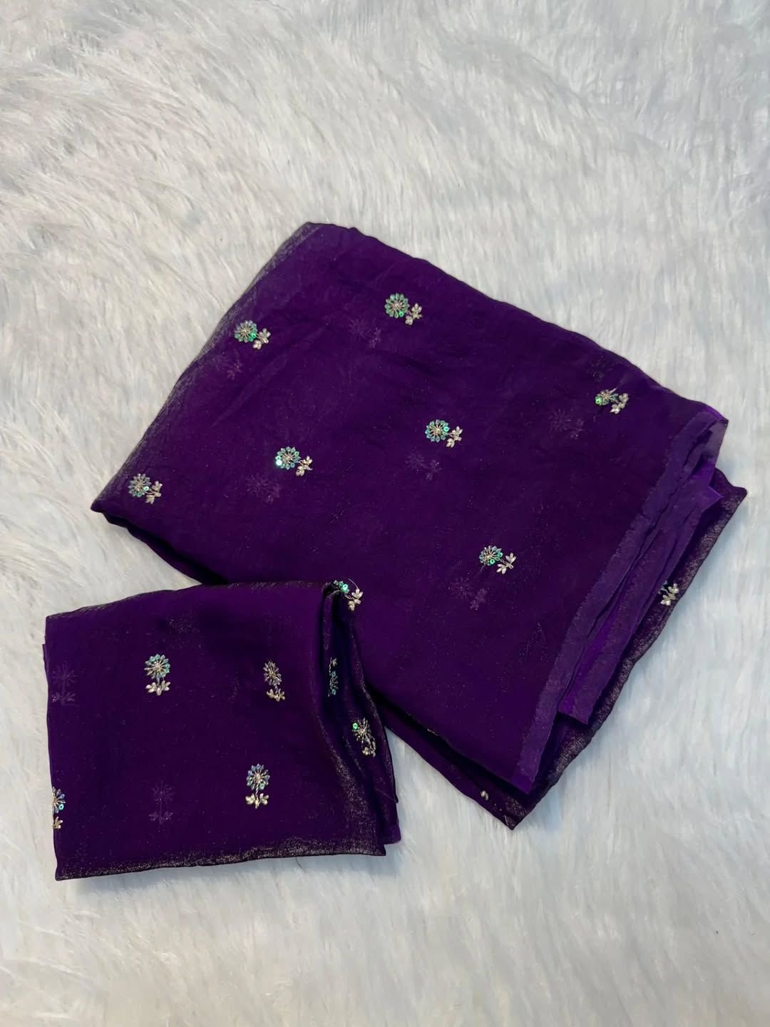 Saree Details -Fendy Sattin Dual Shaded With Beautiful Zari With Sequence Work Flower Butti All In Saree & Contrast Blouse Work !!