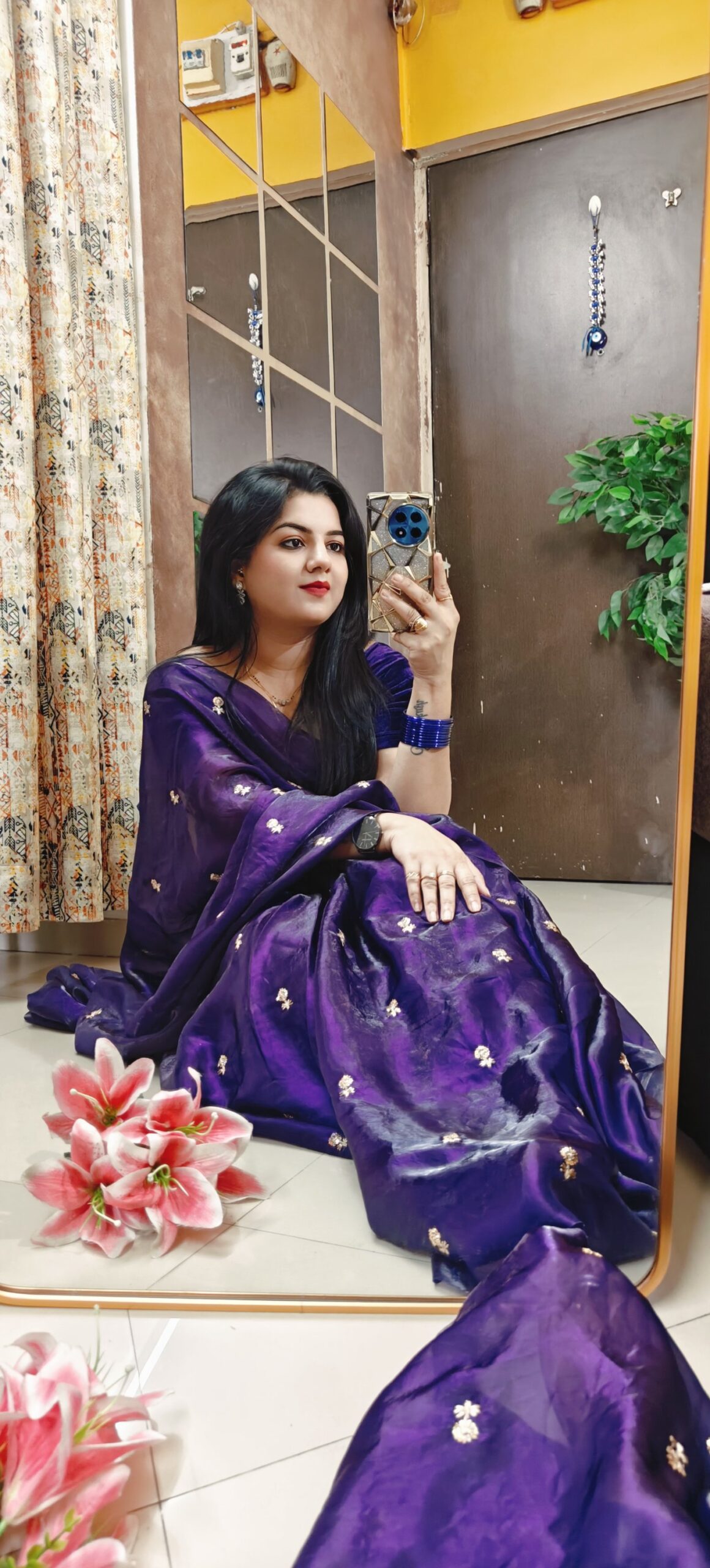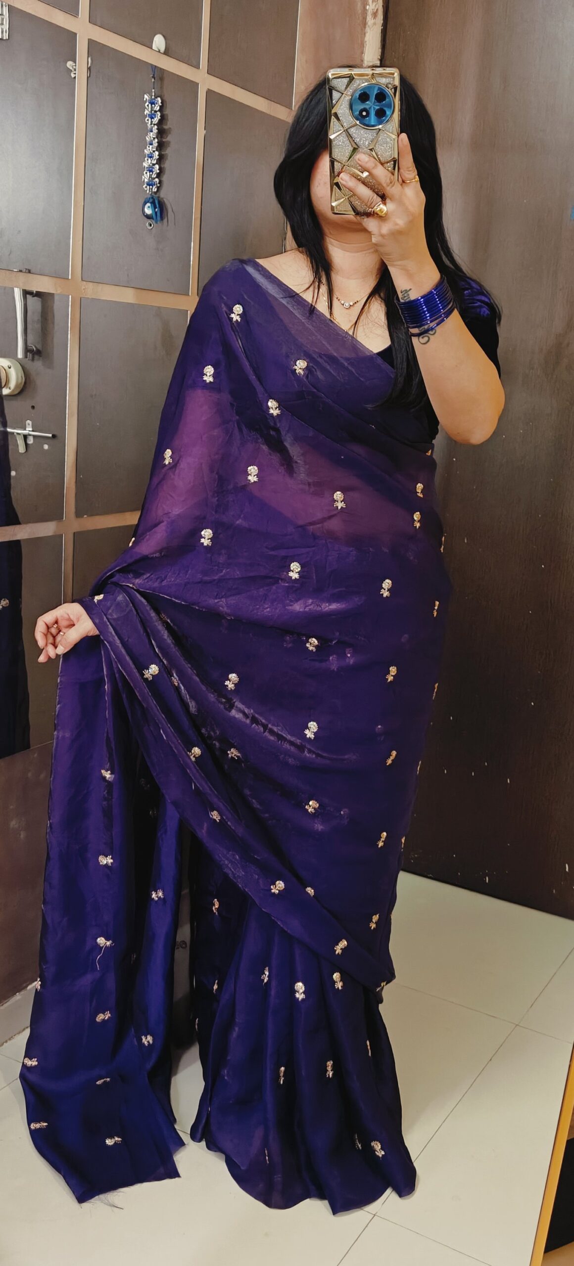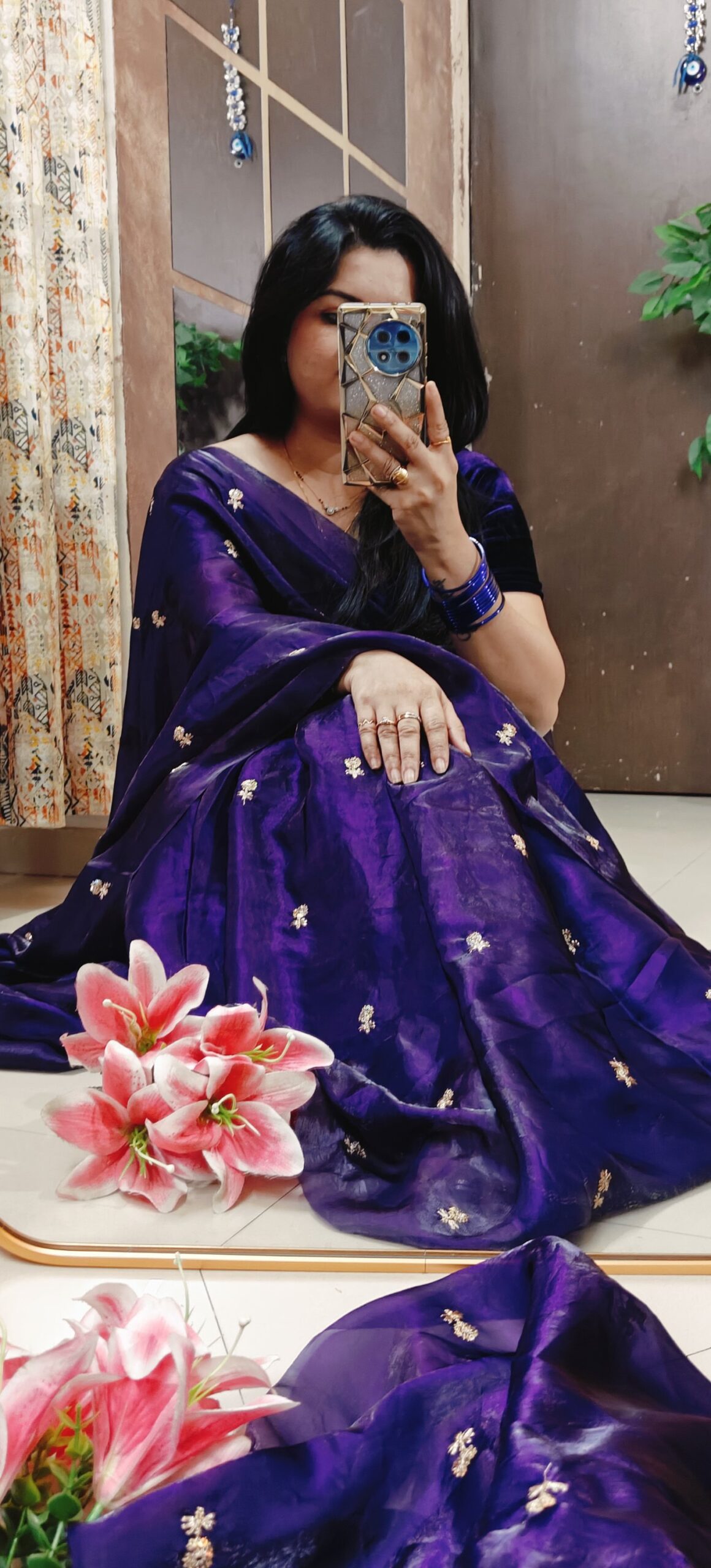 Saree Details -Fendy Sattin Dual Shaded With Beautiful Zari With Sequence Work Flower Butti All In Saree & Contrast Blouse Work !!