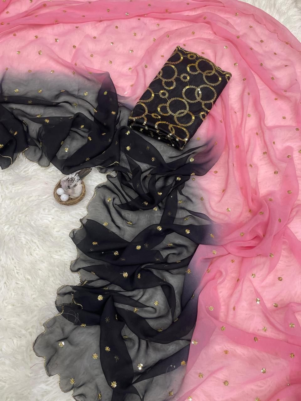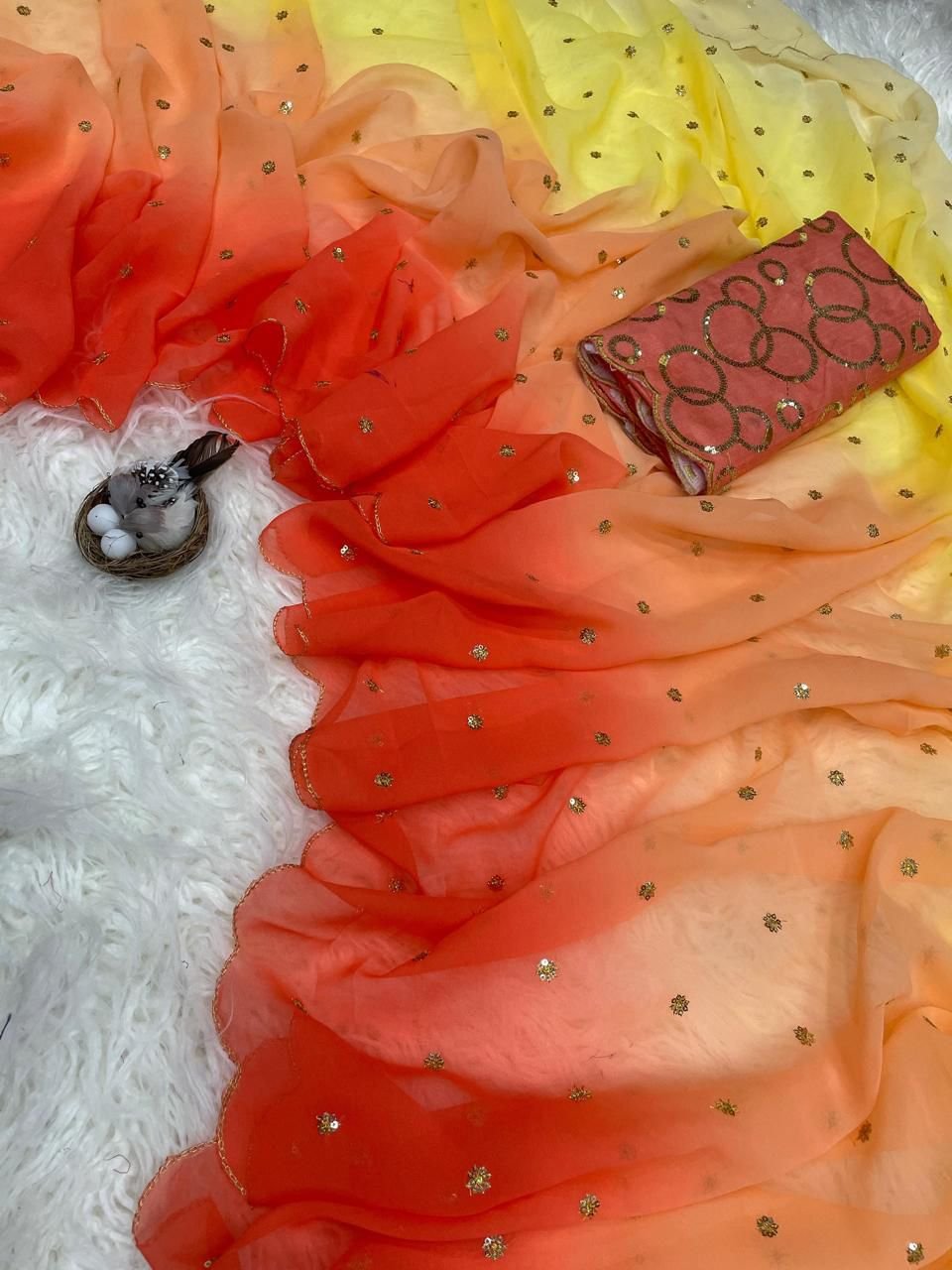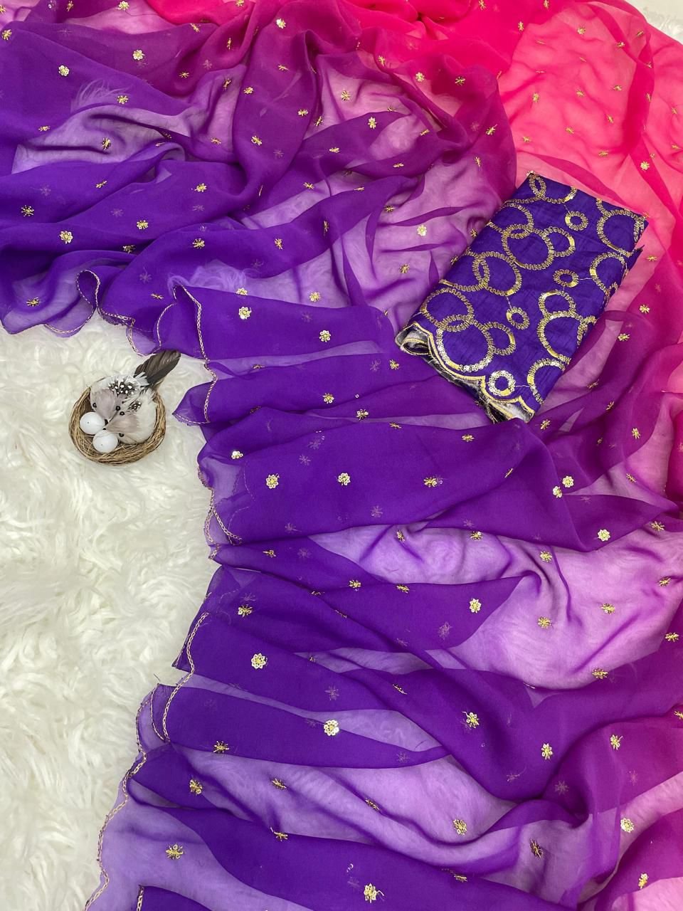 Pure Georgette saree with sequence worked Butti with beautiful arco with contrast worked blouse