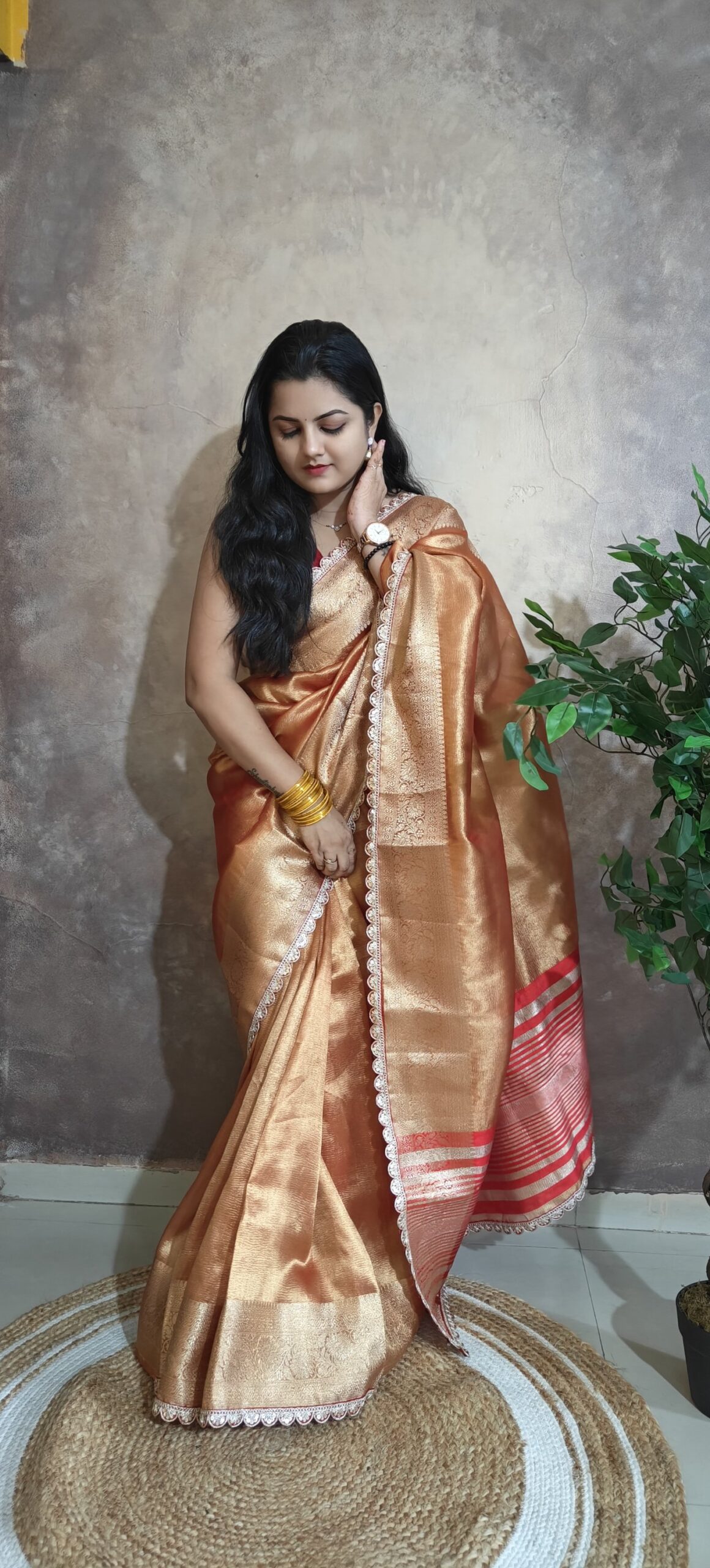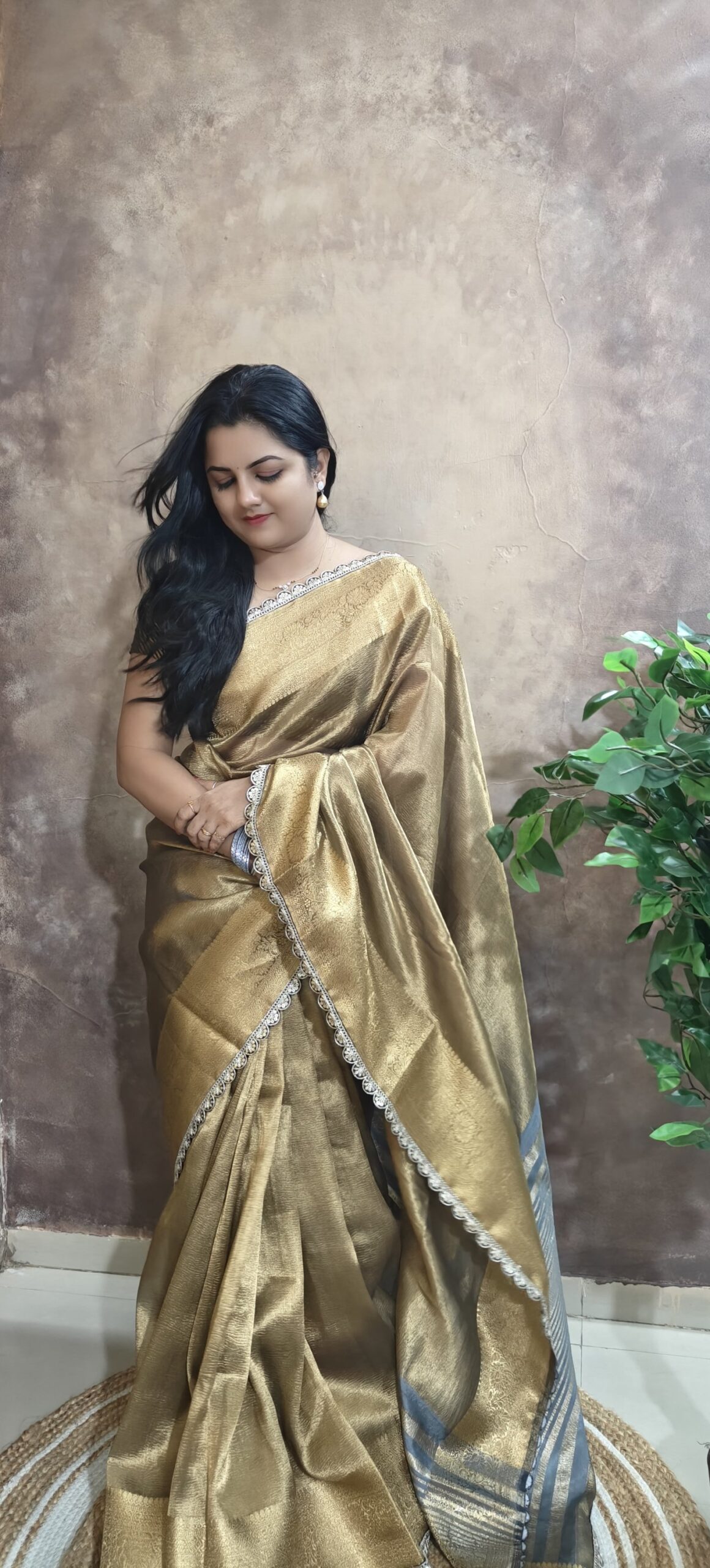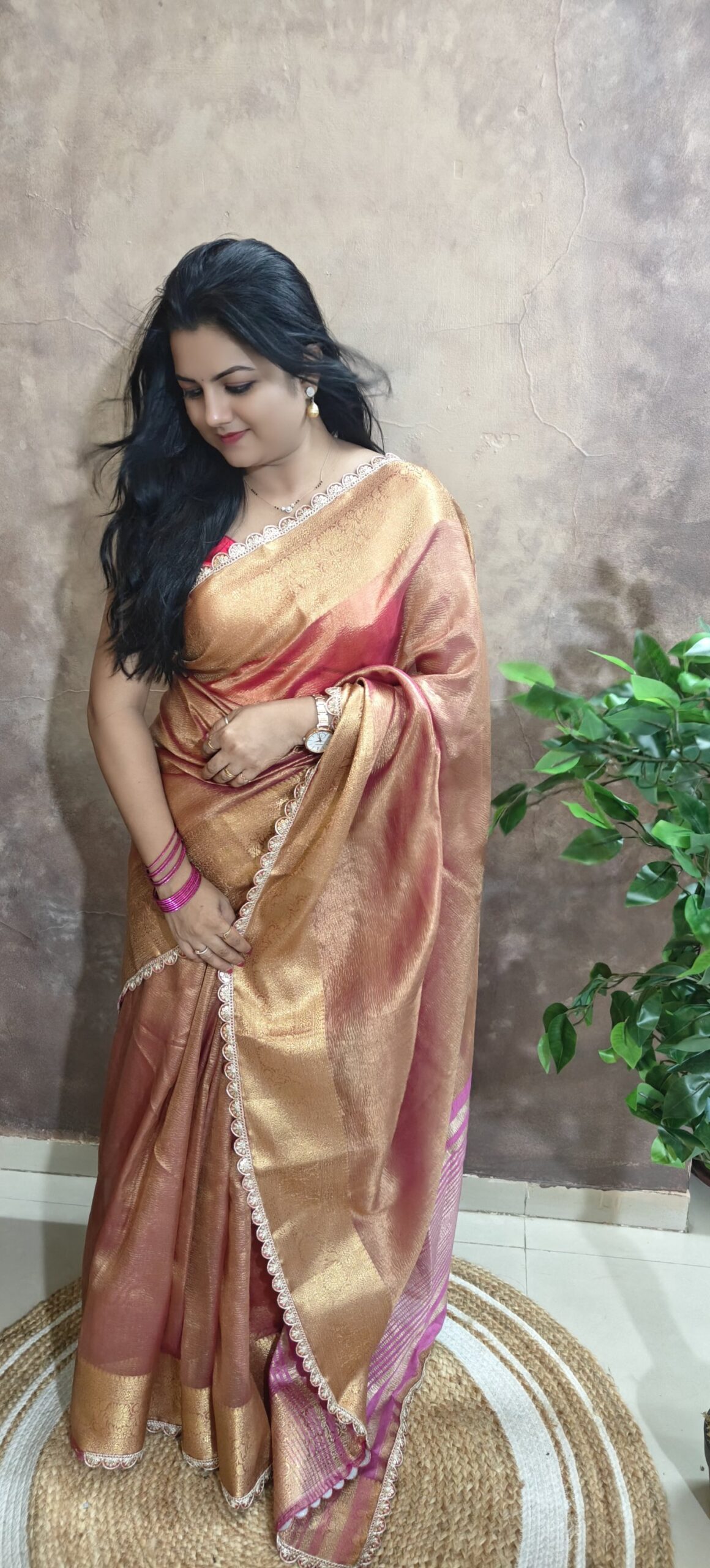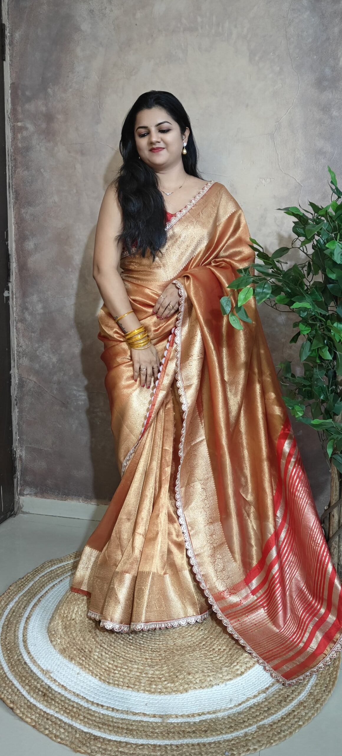 Elegance meets tradition in this exquisite Banarasi tissue silk saree. Crafted with a luxurious golden tissue base, it features intricate zari weaving, a soft pink undertone, and a delicate lace border that adds a modern charm. Perfect for festive occasions, weddings, or elegant celebrations.